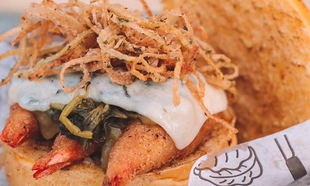 Burguer de Camarão rosa crocante, creme de tucupi com jambú, queijo mussarela maçaricado e cebola crispy.