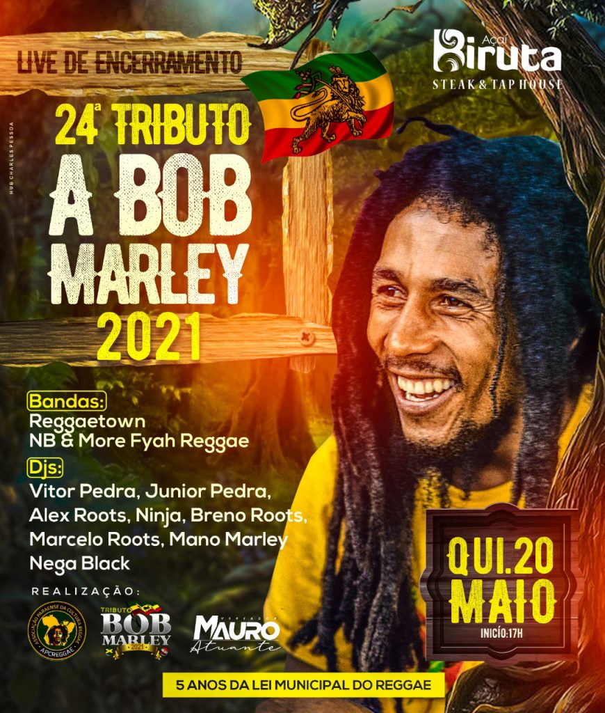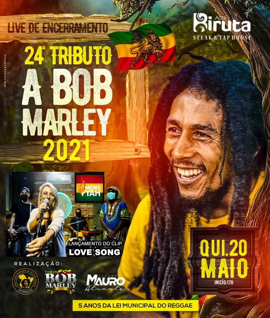 Quinta, 20 de maio de 2021, a partir das 17h. Live de encerramento do 24º Tributo a Bob Marley. Lançamento do Clipe “Love Song” da banda More Fyah. Participações da banda Reggaetown e DJs e colecionadores de vinil. Convite solidários limitados 2kg de alimentos. Info (91) 98471-2738