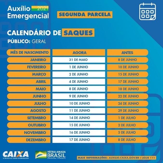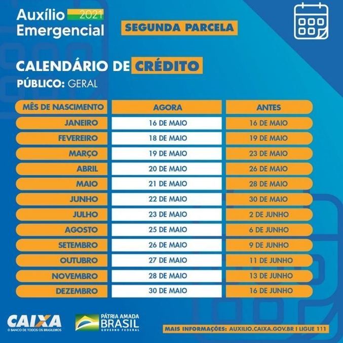 O calendário do público geral (aplicativos e meios digitais e inscritos no CadÚnico) é dividido em quatro ciclos, de créditos e de saques. Já os integrantes do Bolsa Família recebem de acordo com o calendário regular do programa. Nesta quarta-feira, recebem o benefício as pessoas com NIS final 7.