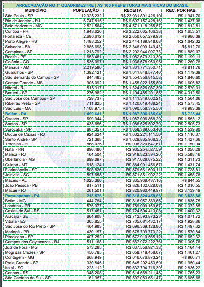 Dados levantados pelo Blog do Zé Dudu nesta segunda-feira (21), com base na arrecadação oficial declarada pelas prefeituras aos órgãos de controle externo, mostram que as 100 prefeituras mais ricas do Brasil — e Brasília não entra nessa conta por não ter prefeitura — arrecadaram juntas R$ 114,6 bilhões consolidados no período de janeiro a abril. É dinheiro suficiente para sustentar o Pará inteiro por quatro anos e meio.