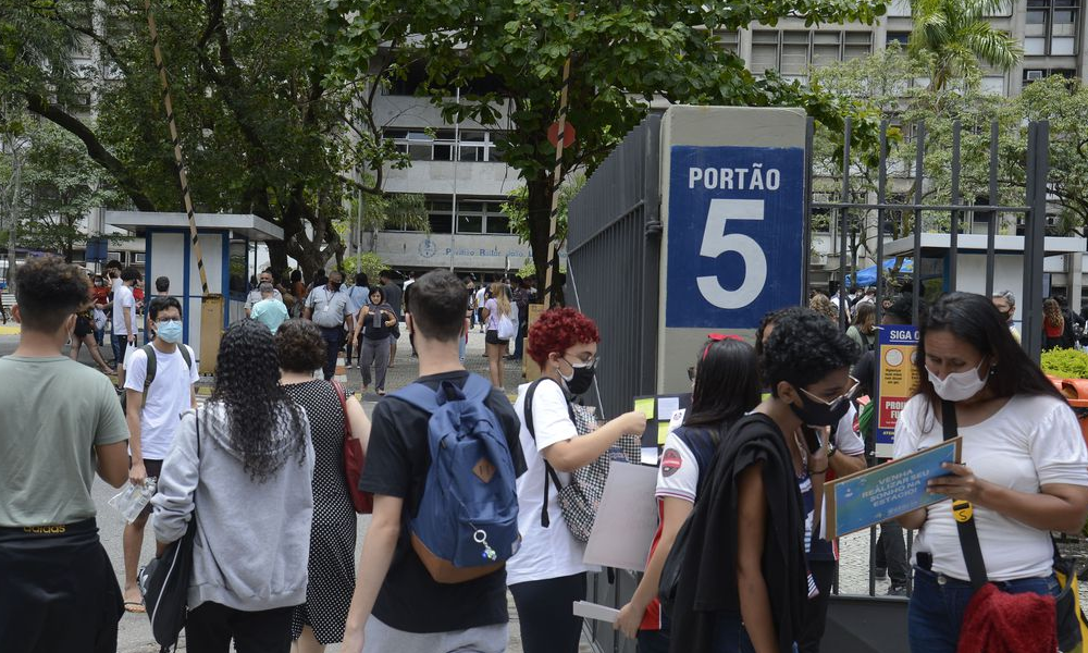 Um grupo de jovens também foi à porta da Uerj com um cartaz em protesto em defesa do Enem e da educação. “Pelo direito de estudar. Contra a censura e o desmonte do Enem”, dizia o texto, assinado pelo coletivo Juntos.