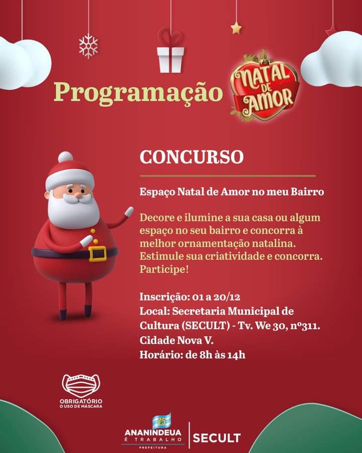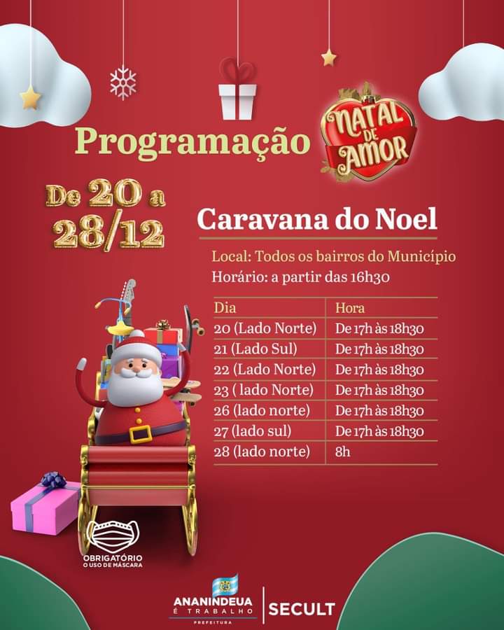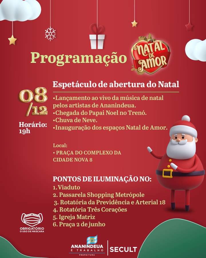 O mundo mudou com a pandemia, e mais do que nunca o amor e a fé farão a diferença na reconstrução de sonhos e na retomada da esperança. É com esse espírito que a Prefeitura de Ananindeua promoverá no município por meio da Secretaria Municipal de Cultura (Secult), a partir desta quarta-feira, 08, a programação “Natal de Amor” que irá Iluminará as ruas, praças e bosques da cidade e contará com apresentações musicais e teatrais. .