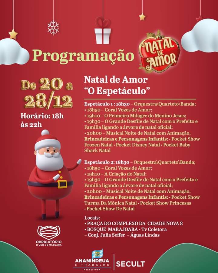 A programação inclui pontos de iluminação e decoração que estarão espalhados por todo o município. As atrações como orquestras, bandas, coros, teatro e dança serão realizadas pelos artistas do município para valorizar a cultura local. Os espaços temáticos ‘A Vila do Papai Noel’ e a ‘Vila dos Duendes’ funcionarão na Praça Chiara Lubich e no Bosque Marajoara, de 18h as 22h, entre os dias 20 a 28.