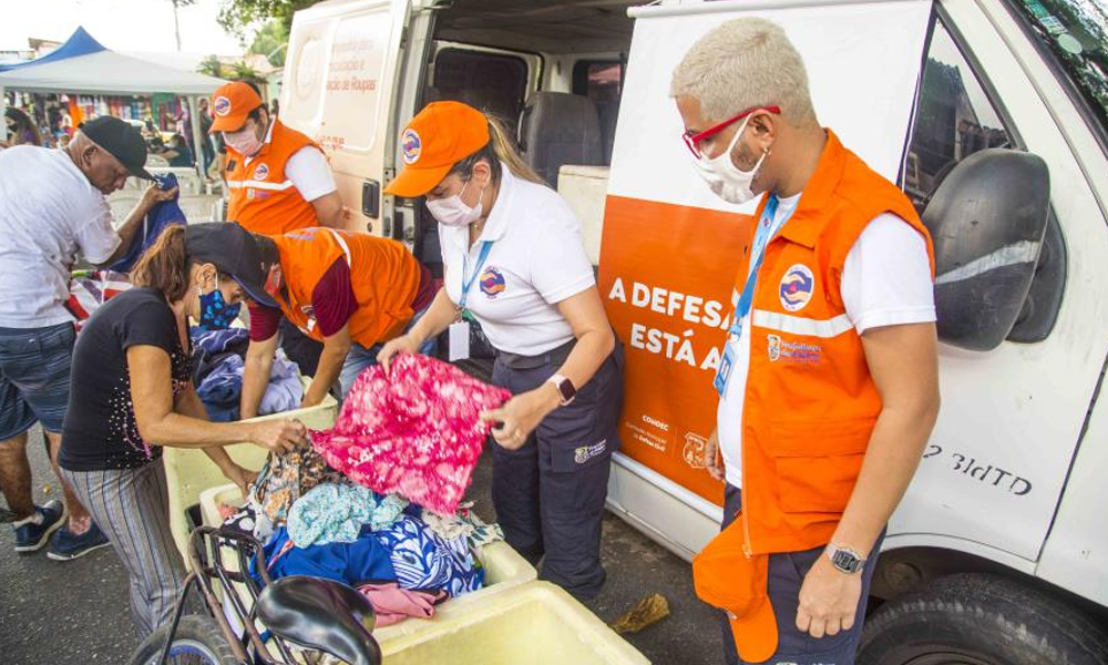 A feirante Lene Araújo, 46, que trabalha há 10 anos com o esposo vendendo farinha de tapioca na feira, estava empolgada com as novas peças de roupa que havia escolhido na van da Defesa Civil que levou para o local a campanha itinerante “Doe o que puder. Pegue o que precisar”. “Foi uma ótima oportunidade pra gente, eu escolhi algumas roupas”, contou a feirante que elogiou todos serviços oferecidos no evento. “Eu achei muito boa essa ação. Tava faltando aqui, principalmente, o serviço de CadÚnico. A minha filha veio também pra fazer o cadastro dela”.
