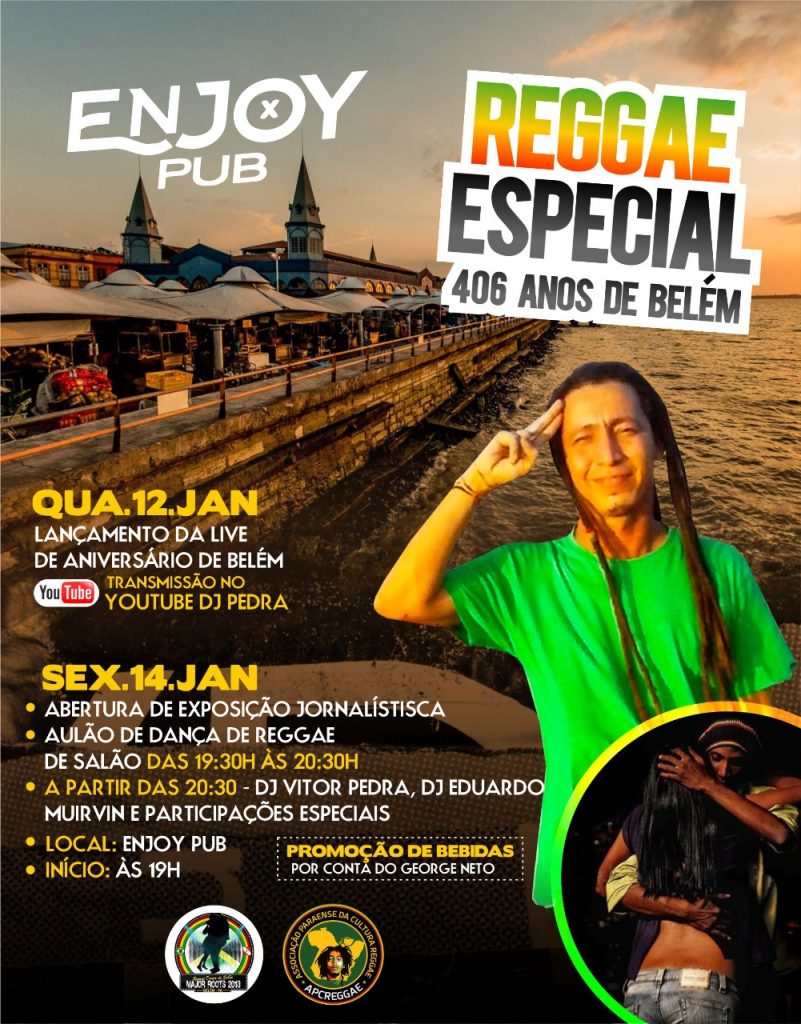 2)Sexta, 14 de Janeiro Exposição Jornalística Reggae Especial 406 anos Belém. Das 19h- Abertura da exposição jornalística aniversário de Belém. 19h30-Oficina Reggae de Salão. 21h- As Pedras rolam com DJ Vitor Pedra, DJ Eduardo Murvin e mais participações especiais no Enjoy Pub. End: Rua Pombal, 210 na Praça Brasil . Info (91) 984712738.