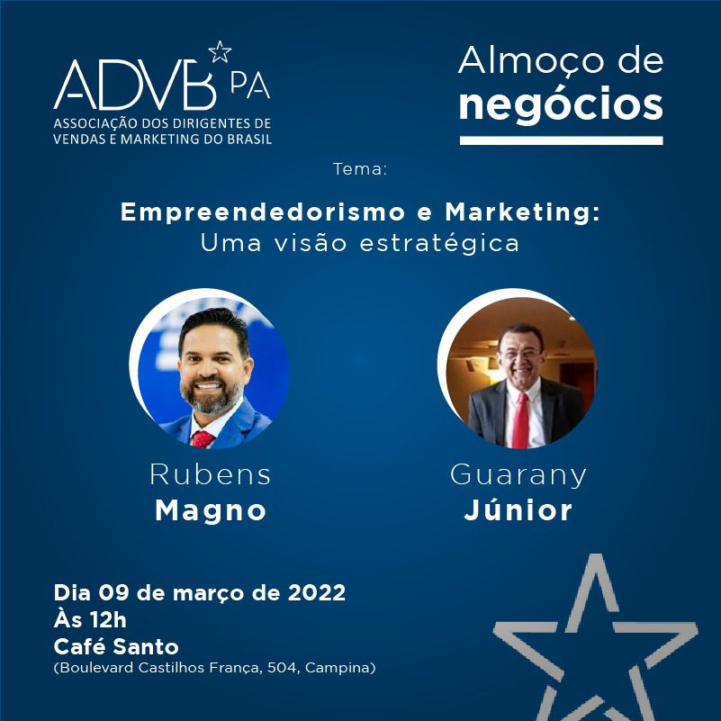 “Empreendedorismo e Marketing: uma visão estratégica” é o tema do tradicional Almoço de Negócios da ADVB, nesta quarta-feira (9), às 12h, no Café Santo. É um evento exclusivo para associados e convidados com palestra do superintendente do Sebrae, Rubens Magno e do professor, jornalista e consultor, Guarany Júnior.