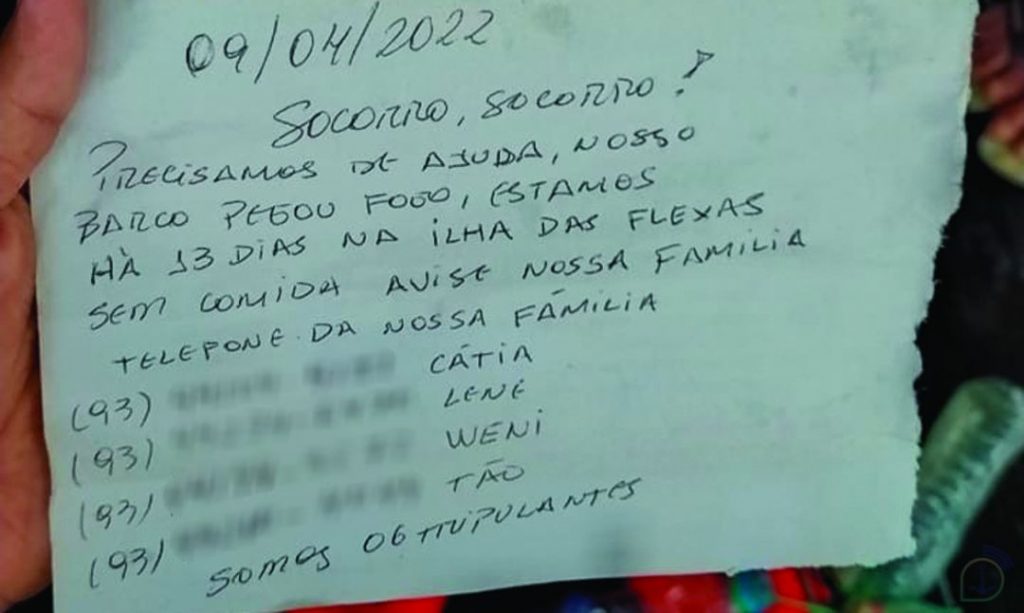 “Precisamos de ajuda. Nosso barco pegou fogo, estamos há 13 dias na ilha das flechas sem comida. Avise nossa família”, escreveram os náufragos, que informaram também os contatos telefônicos de seus familiares.