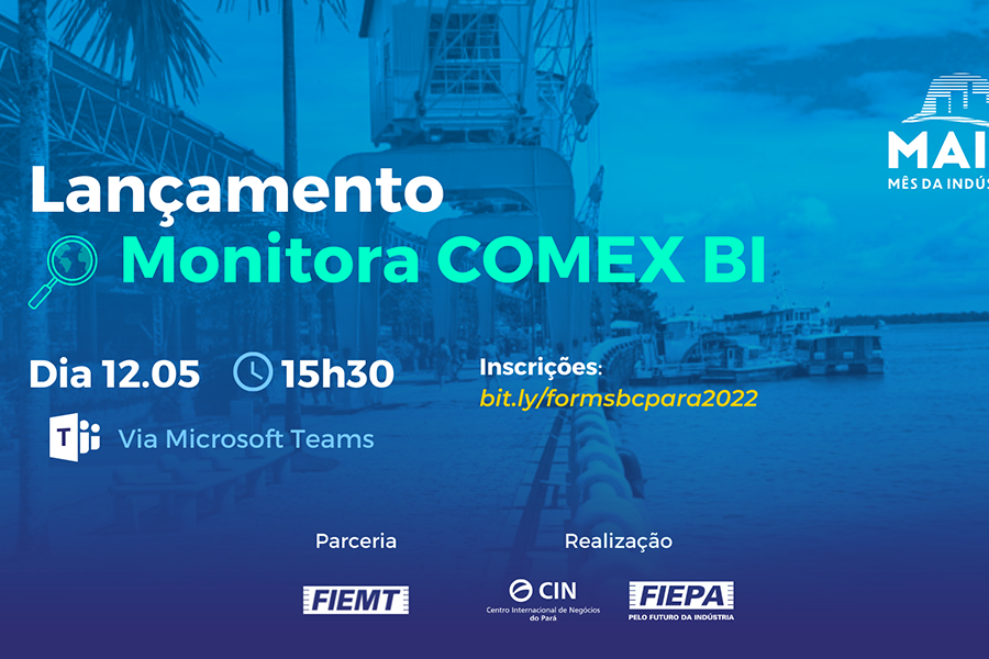 Como parte das comemorações pelo Mês da Indústria, o Sistema Federação das Indústrias do Estado do Pará (FIEPA) lançará o Monitora Comex, plataforma de business intelligence (BI) elaborada pelo Centro Internacional de Negócios (CIN/FIEPA), com informações sobre os principais produtos exportados pelo Estado, entre os quais a madeira, frutas, açaí, pescado, camarão, móveis, cacau e seus derivados, entre outros. O lançamento ocorrerá no próximo dia 12/05, de forma virtual por meio da Microsoft Teams, às 15h30, mediante inscrições que podem ser feitas previamente pelo link .