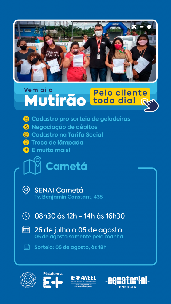 A população de Cametá vai aproveitar duas semanas de serviços gratuitos oferecidos pela Equatorial Energia Pará no Mutirão “Pelo Cliente Todo Dia”, que acontece de 26 de julho a 05 de agosto, no prédio do SENAI, Tv. Benjamin Constant. Na ação serão feitas troca de lâmpadas gratuitamente, negociação de débitos, cadastro no benefício da Tarifa Social, e a troca de geladeiras no programa E+ Geladeira Nova.