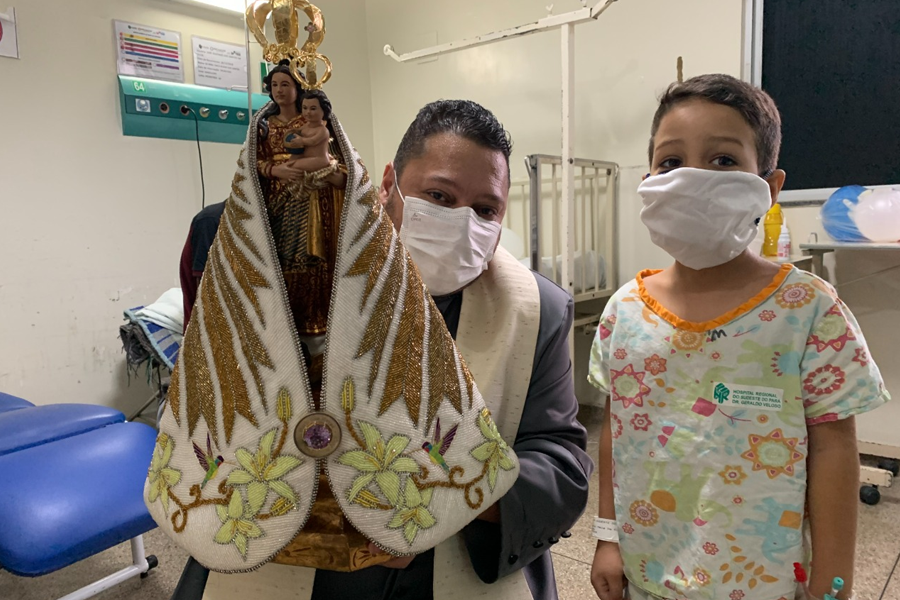 Arthur David, de apenas seis anos, da cidade de Nova Ipixuna, se recupera de um procedimento cirúrgico na clínica pediátrica. Ele estava empolgado com a visita da padroeira dos paraenses e fez questão de participar do momento religioso.