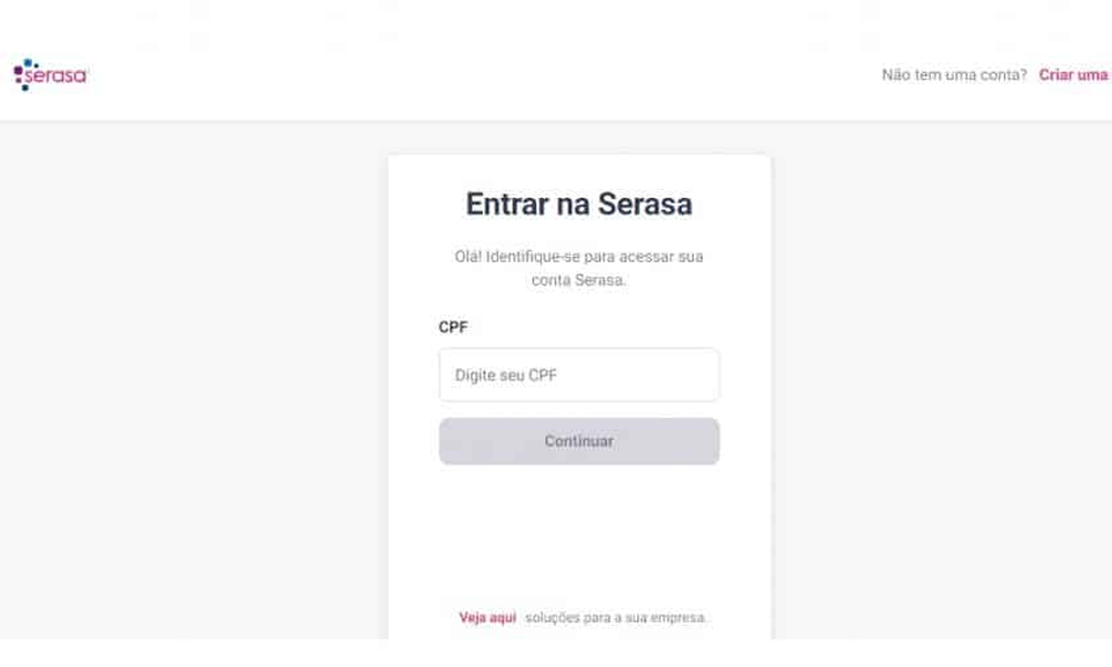Caso você tenha certeza que não tem conta no Serasa, aparecerá uma opção para que você possa criar. Porém, se for necessário, coloque o seu CPF para conseguir ter certeza se existe ou não uma conta aberta, pois se não tiver, ele te direcionará para criar uma conta.