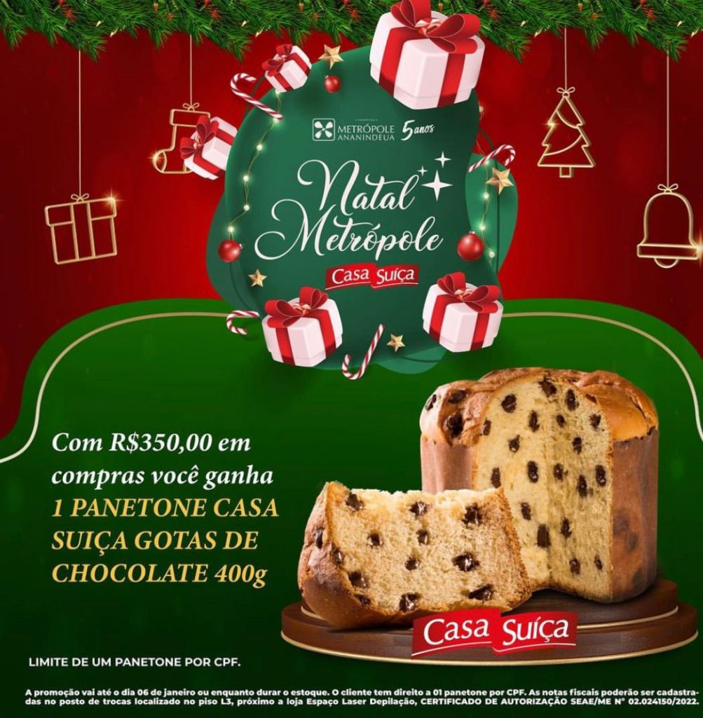 A campanha de final de ano do Shopping Metrópole Ananindeua irá presentear com um delicioso panetone todos os clientes que participarem da promoção que segue até o dia 06 de janeiro. Para participar da campanha, basta acumular compras de R$ 350 em qualquer uma das lojas participantes para ganhar um Panettone Casa Suíça Gotas de Chocolate de 400g.