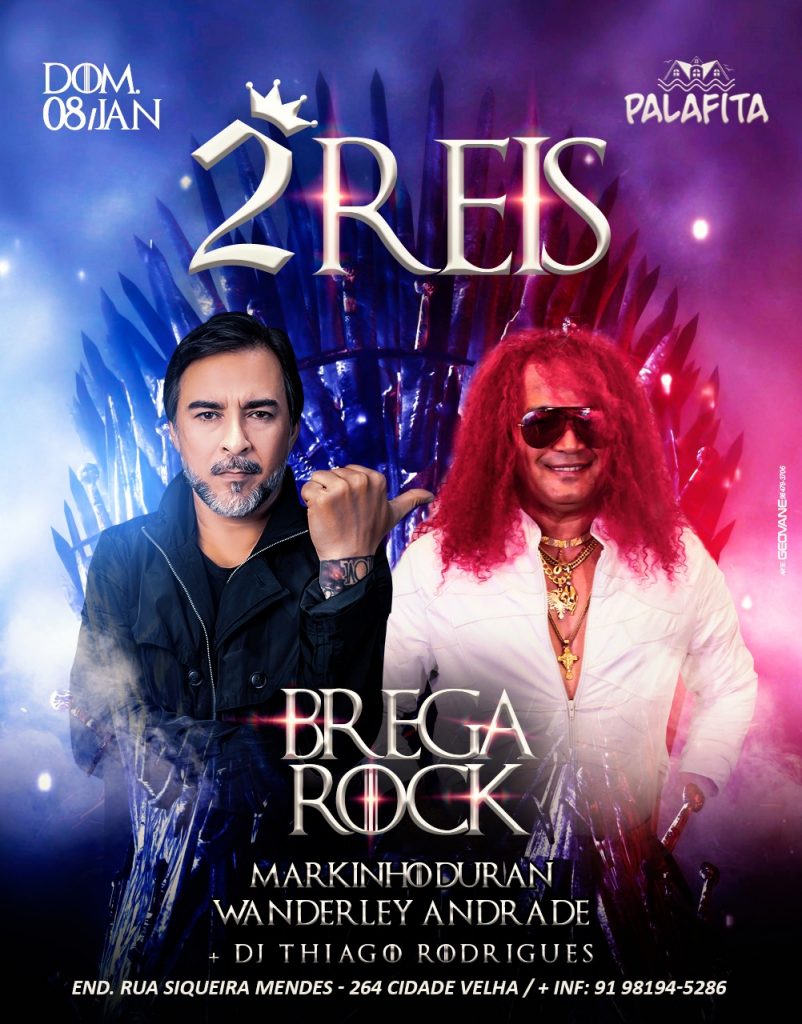 A primeira grande festa real deste novo ano vai ser realizada neste domingo, 8 de janeiro, a partir das 16h na casa de shows Palafita, que vai reunir dois grandes artistas da música paraense: Markinho Duran e Wanderley Andrade, que vão se apresentar no show “Brega Rock” em uma noite intitulada “2 Reis”, onde vão oportunizar um dos maiores encontros musicais da cidade.