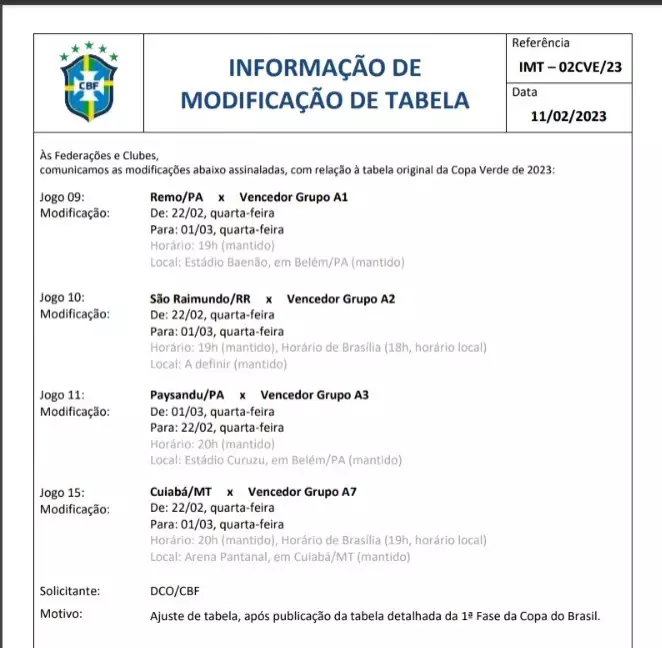 Atemporada de 2023 mal começou e como já tem acontecido nos últimos anos, o futebol brasileiro mais uma vez sofre com o problema de aperto no calendário em função do acúmulo de competições. E para que isso não seja mais uma dificuldade aos clubes, a Confederação Brasileira de Futebol (CBF) realizou algumas modificações na tabela da Copa Verde.