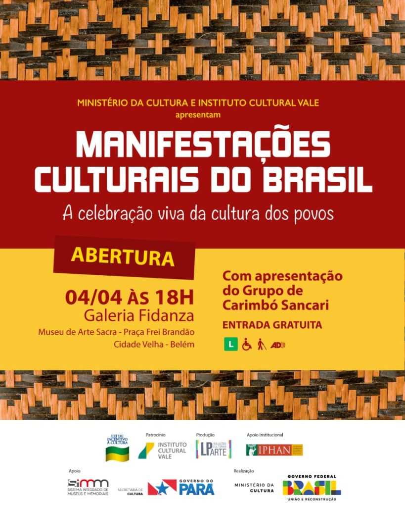 Um mergulho na diversidade e riqueza cultural brasileira é a proposta da Exposição “Manifestações Culturais do Brasil – A Celebração Viva da Cultura dos Povos”, que chega a Belém no dia 04 de abril e estará aberta à visitação gratuita na Galeria Fidanza (Museu de Arte Sacra) na Cidade Velha. A abertura será às 18h com apresentação do Grupo de Carimbó Sancari.
