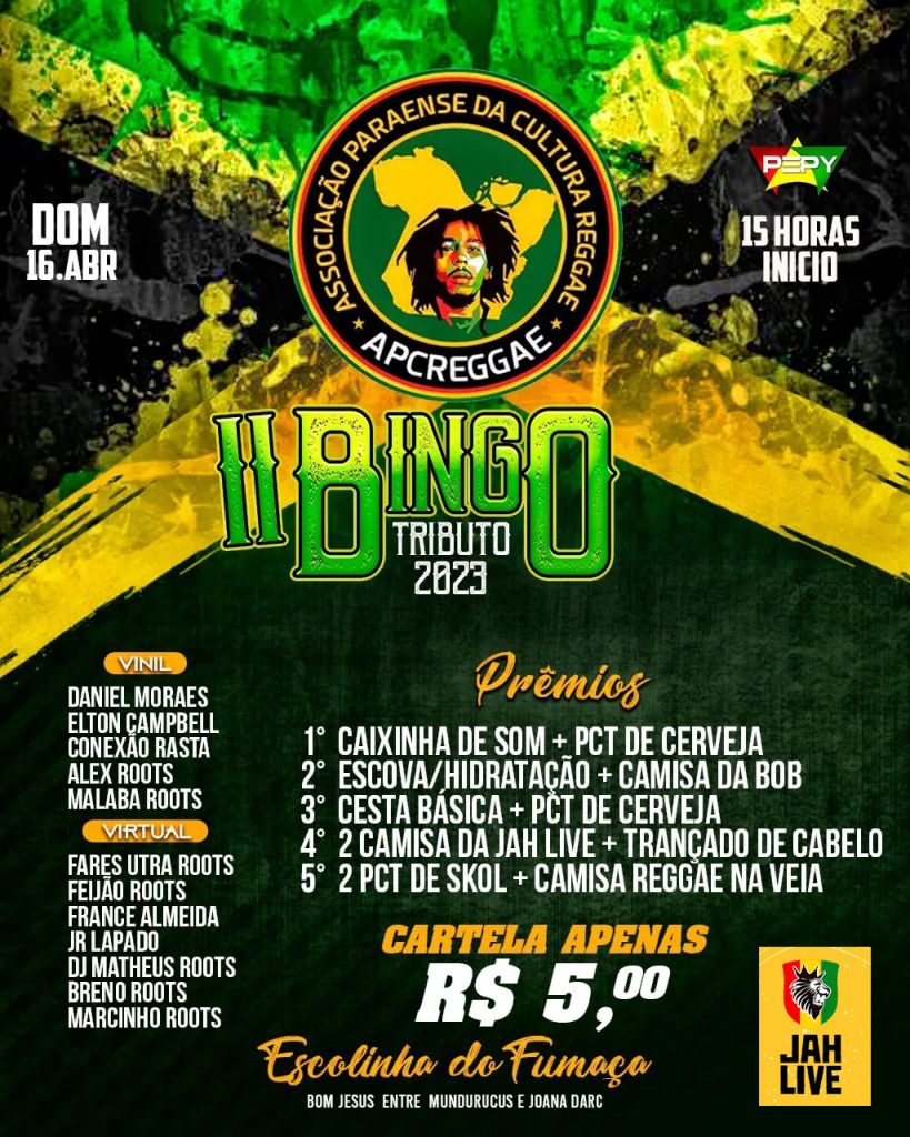 A Associação Paraense da Cultura Reggae (APCREGGAE) realizará no próximo domingo (16) o segundo bingo em busca de recursos para o Festival Tributo a Bob Marley 2023. O evento será realizado no Bar do Fumaça, localizado na passagem Bom Jesus, entre as ruas Mundurucus e Joana Darc na Terra-Firme. Durante o bingo, haverá apresentações de DJs, colecionadores de vinil e equipes ligadas ao movimento reggae.
