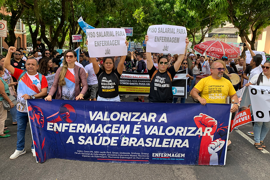 O Sindicato dos Trabalhadores em Saúde do Estado do Pará (Sindsaúde-PA) reforça seu compromisso com a luta em defesa do pagamento do piso nacional da enfermagem aos profissionais que atuam no Pará. Conforme orientação do Fórum Nacional e Estadual da Enfermagem, o Sindsaúde-PA reitera que mantém o Estado de Greve, conforme decidido pela categoria, durante assembleia geral realizada no último dia 30 de junho, na Praça da República, em Belém. Com isso, os (as) trabalhadores (as) permanecem vigilantes à atual conjuntura e não descartam a realização de uma nova Greve Geral.