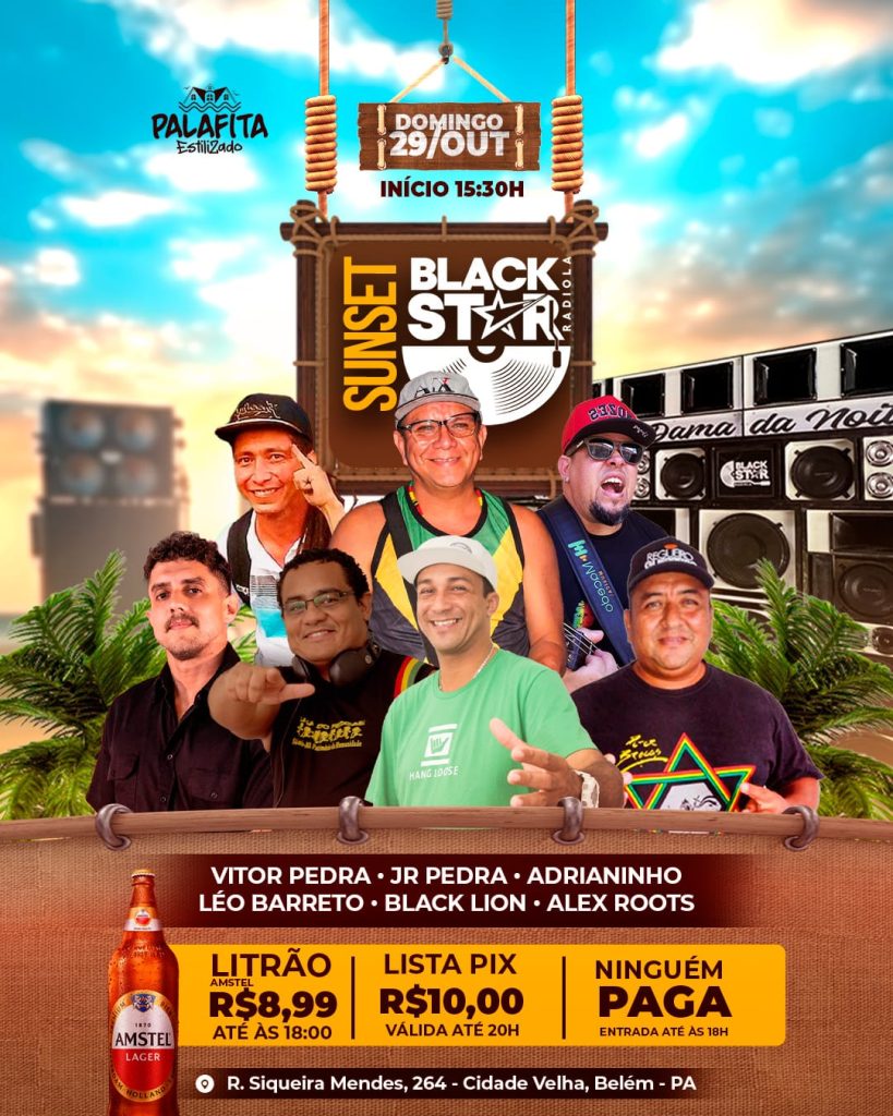 A primeira edição do Sunset da Black Star no Palafita foi um sucesso, com casa lotada e muitos elogios à iniciativa. A próxima edição será no domingo (29), com entrada liberada das 15h30 às 18h e happy hour até às 18h. Quem quiser aproveitar ainda mais, pode chegar mais cedo e curtir o almoço no Palafita, que serve pratos típicos da culinária regional. Com os talentosos DJs, incluindo Vitor Pedra, Jr. Pedra, Léo Barreto, Alex Roots, Black Lion e o cantor Adrianinho Yeman Jah, fazendo sequência especial para a massa regueira  curtir e dançar nas vertentes do reggae.