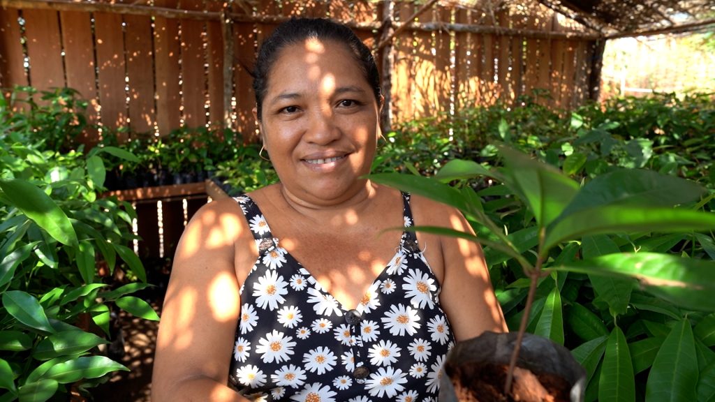 Janilce Souza é uma das produtoras que fazem parte do processo há 15 anos. Às margens do Lago, na comunidade Jauari, ela ergueu seu viveiro que possui mais de 1mil mudas. Com carinho e dedicação ela cuida de suas plantas em uma missão que vai além do sustento familiar, torna-se uma vasta contribuição para a arborização e a existência destas árvores na natureza e protegendo o meio ambiente.