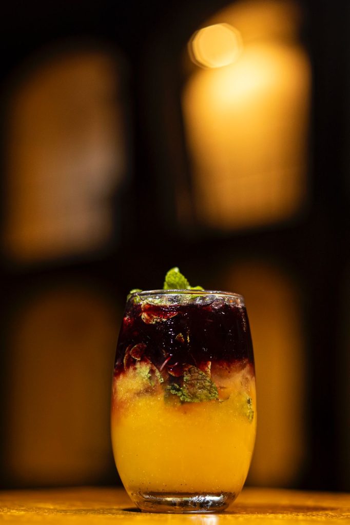 Ingredientes: gin amz, xarope de buriti, mel, bitter de cacau, limão siciliano e Float de vinho de açaí.