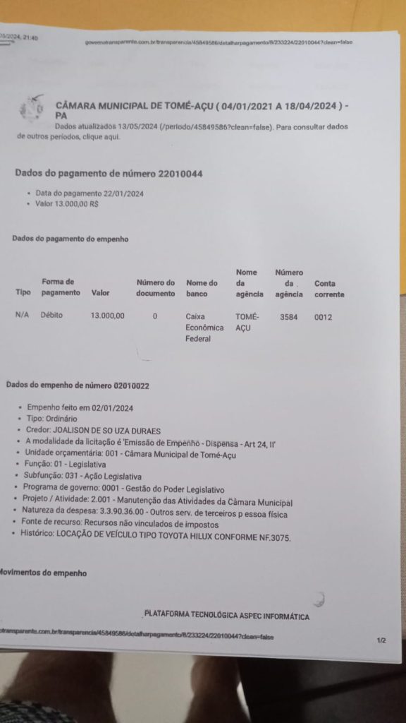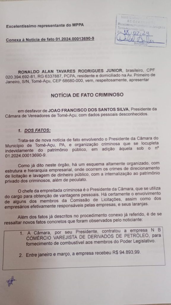 Uma bomba política abalou ontem, quinta-feira, 18, os bastidores da administração municipal de Tomé-Açu, município do nordeste paraense, a 187 quilômetros de Belém, com a formalização de uma denúncia por corrupção contra o presidente da Câmara de Vereadores, João Francisco dos Santos Silva. O Ministério Público recebeu um documento contendo oito graves acusações contra o vereador, desencadeando uma nova fase de tensão e incertezas na política local.
