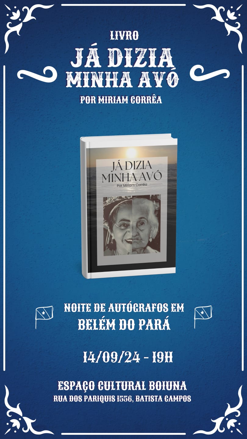 “Depois de 40 anos navegando, aliada à vontade de escrever meu primeiro livro, resultou na obra “Já dizia minha avó”. Os ventos e a maré estão a nosso favor. A publicação está repleta de histórias de vida, curiosidades engraçadas, reviravoltas, superações, alegrias, vivências familiares e com amigos. Tudo em crônicas redigidas com a sinceridade que sempre carreguei na vida. Fica o convite a todos para prestigiar o lançamento em Belém”, comentou Miriam Corrêa.