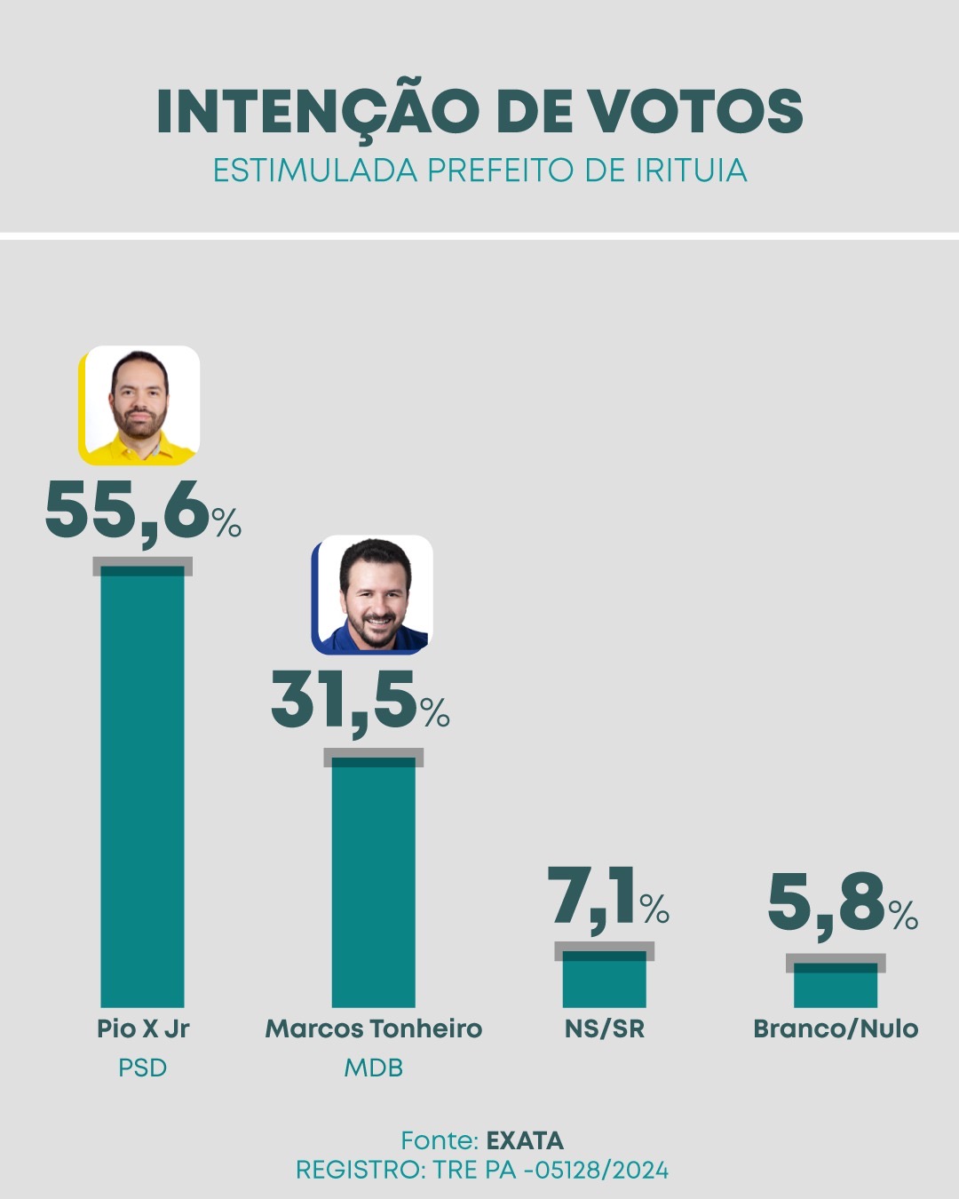 Pesquisa de intenção de votos realizada pelo Instituto Exata e registrada no Tribunal Regional Eleitoral – T.R.E mostra que o candidato Pio X Jr. (PSD) está liderando a corrida eleitoral pela Prefeitura de Irituia. Segundo os dados, Pio X Jr. conta com o apoio de 55,6% dos eleitores na pesquisa estimulada. Já o atual prefeito, Marcos Tonheiro, aparece com 31,5%, enquanto 7,1% dos entrevistados disseram não saber ou não responderam (NS SR). A parcela dos que afirmaram votar em branco ou nulo foi de 5,8%. A pesquisa também avaliou a rejeição dos candidatos. Quando questionados sobre em quem não votariam de maneira alguma, 52,9% dos eleitores responderam Marcos Tonheiro, indicando uma alta rejeição ao atual gestor.