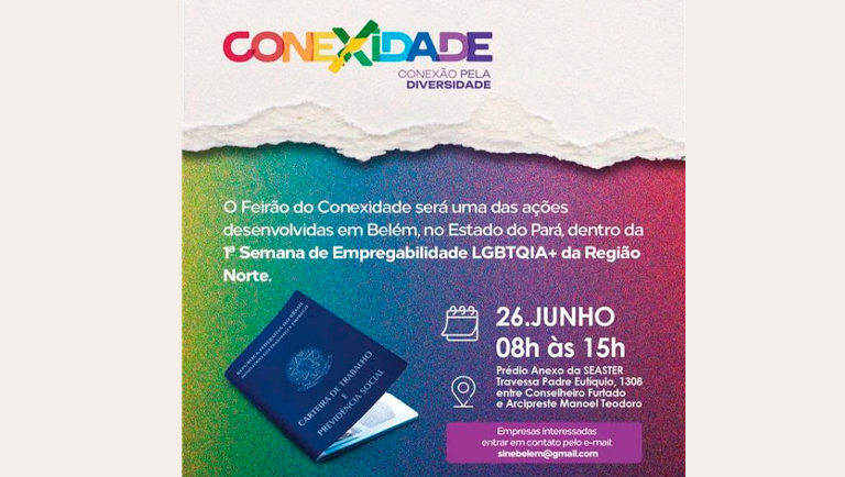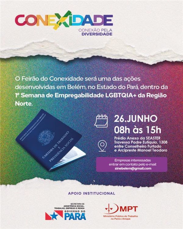 No mês de junho, o Ministério Público do Trabalho no Pará e Amapá (MPT PA-AP) realiza a primeira edição do projeto Conexão pela Diversidade: Semana de Empregabilidade LGBTI+ na Região Norte, o Conexidade. Em Belém, o evento acontece no dia 26, em parceria com a Secretaria de Estado de Assistência Social, Trabalho, Emprego e Renda do Pará (SEASTER) e contará com um Feirão de Empregabilidade, no qual serão oferecidas oportunidades de emprego e outros serviços oferecidos pelo Sistema Nacional de Emprego (Sine), com o objetivo de integrar a população LGBTQIA+ no mercado de trabalho.