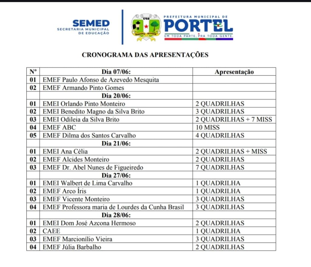 O Arraiá das Escolas 2025 se iniciou no dia 07 de junho e segue até o dia 28, com uma vasta programação nas escolas e espaços públicos. Um dos destaques será a realização da Missa Caipira Escolar, promovendo fé, cultura e identidade local.