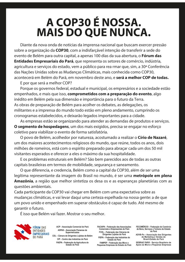 O manifesto das entidades empresariais reforça que a realização da COP30 é mais do que um evento: é uma oportunidade histórica para que Belém e a Amazônia protagonizem os debates sobre as mudanças climáticas. “Receber a COP na Amazônia não é uma opção, é uma necessidade global”, diz um trecho do documento, que lembra o papel estratégico da região nos compromissos climáticos firmados pelo Brasil.