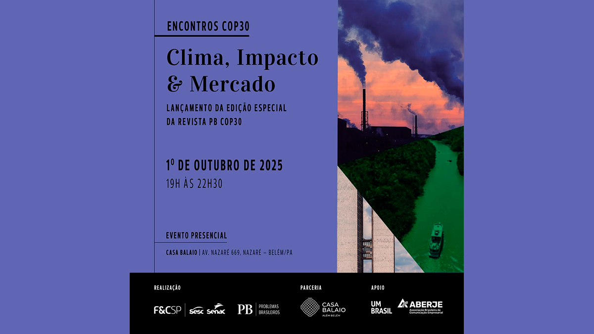A Revista Problemas Brasileiros, publicação da Federação do Comércio de Bens, Serviços e Turismo do Estado de São Paulo (FecomercioSP), e a Casa Balaio, espaço de encontros, cultura e inovação em Belém, vão organizar uma roda de discussão sobre os temas que figurarão, em novembro, nas negociações dos países na COP30. Será em 1 de outubro (quarta-feira), às 19h, na Casa Balaio, na Avenida Nazaré, número