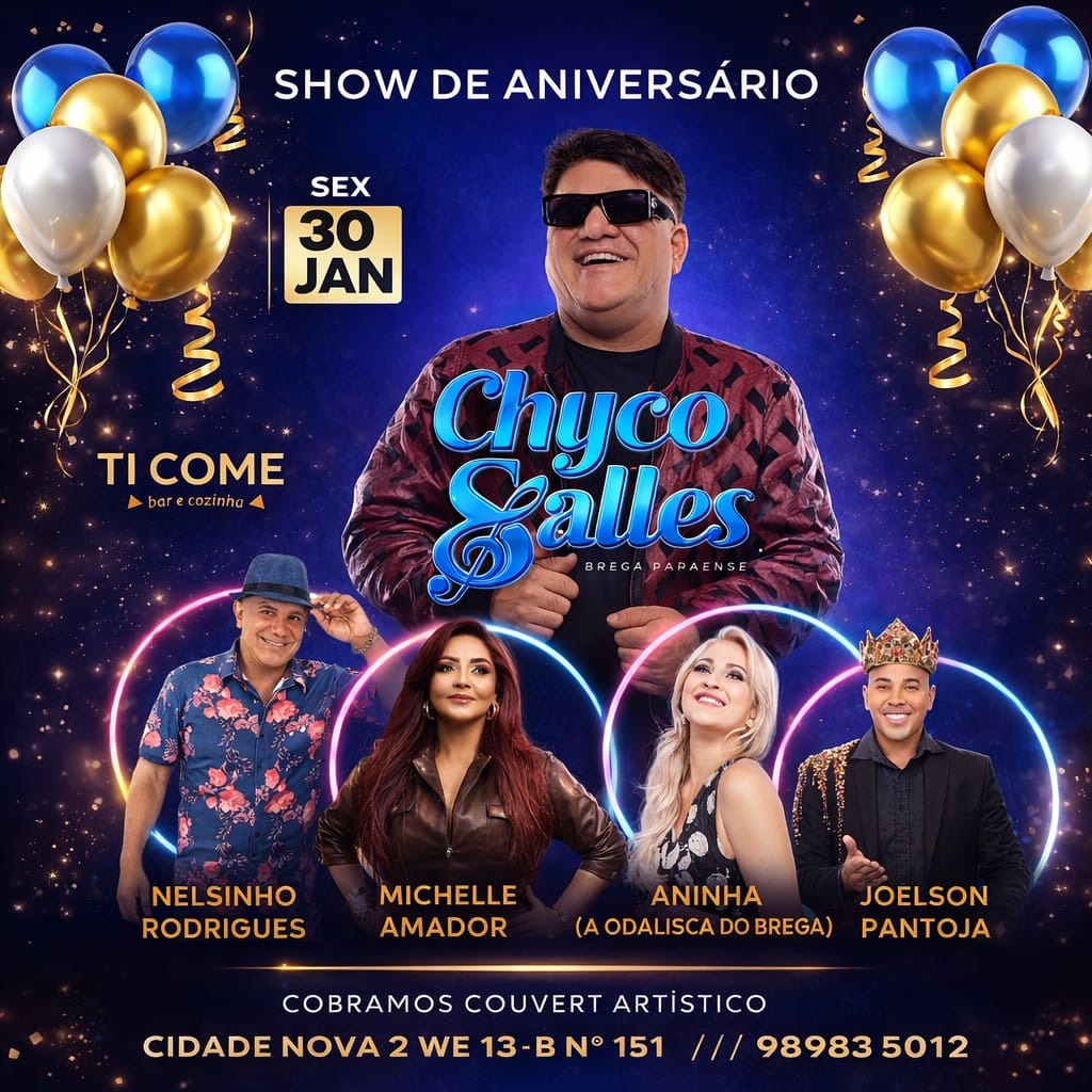O cantor e compositor Chyco Salles celebra mais um ano de vida em grande estilo nesta sexta-feira (30), em Ananindeua, na Região Metropolitana de Belém. A comemoração acontece no palco e reúne alguns dos principais nomes do brega paraense em uma noite marcada por música, amizade e emoção. Ao lado de Nelsinho Rodrigues, Michelle Amadhor (Banda Amazonas), Aninha Odalisca e Joelson Pantoja, o artista promete um encontro especial com o público.