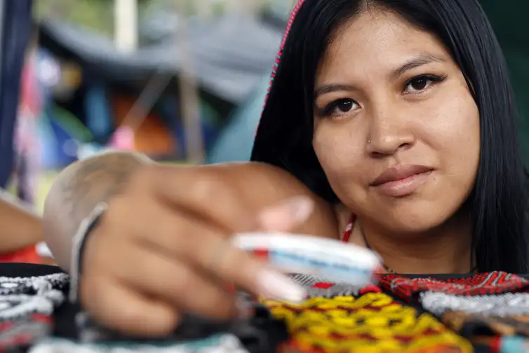 De frente para as peças de madeira de Mazinho, Raira Kamayurá, de 22 anos, demonstra e comercializa braceletes e pulseiras de linhas coloridas feitas em diferentes formatos e larguras de agulhas. Ela diz ver com felicidade não indígenas utilizando as peças. “Cada pessoa que usa mostra que está ao nosso lado na luta”, afirma.